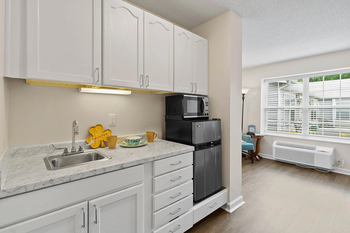 - Private suite or one-bedroom options with a kitchenette